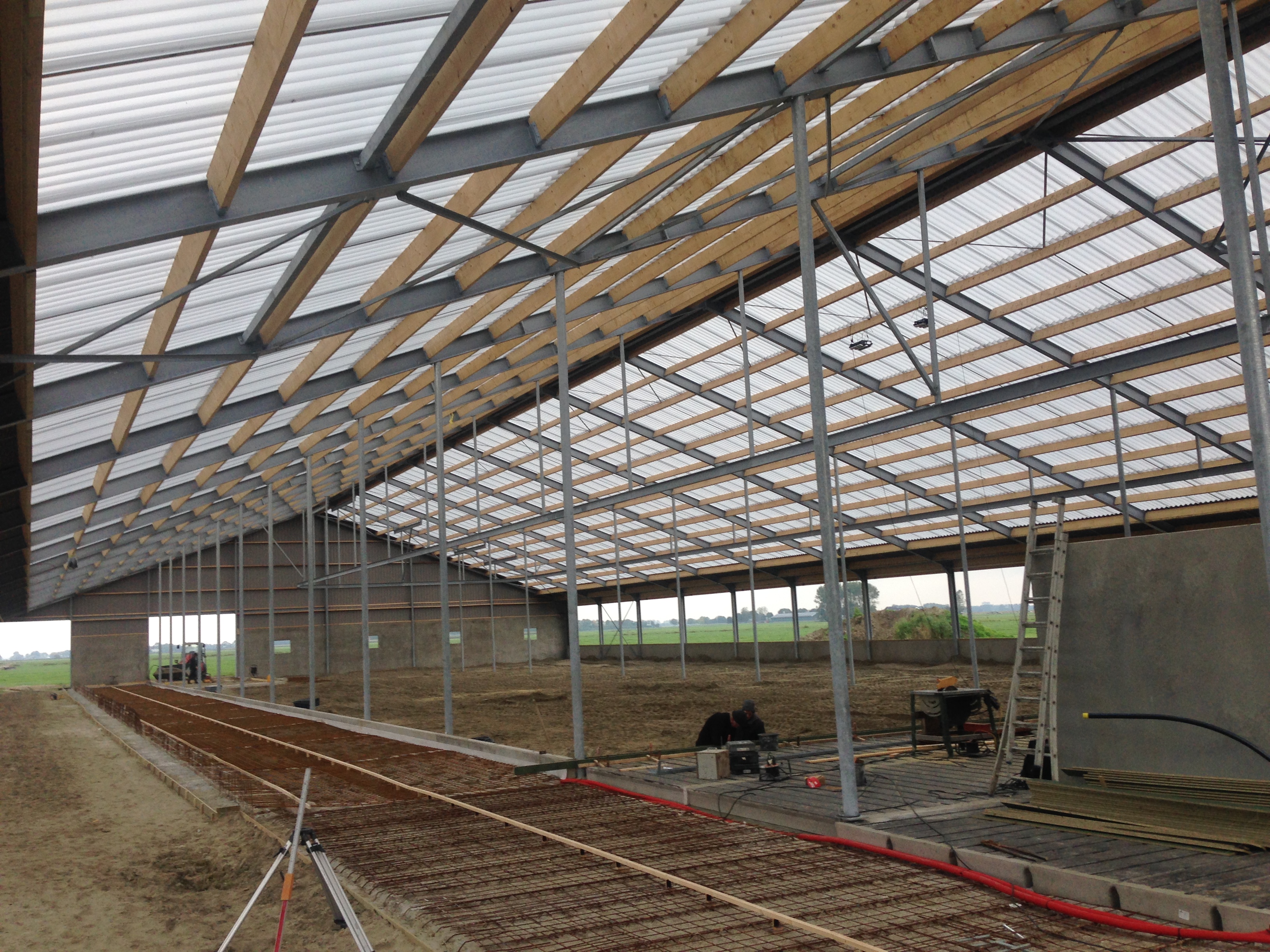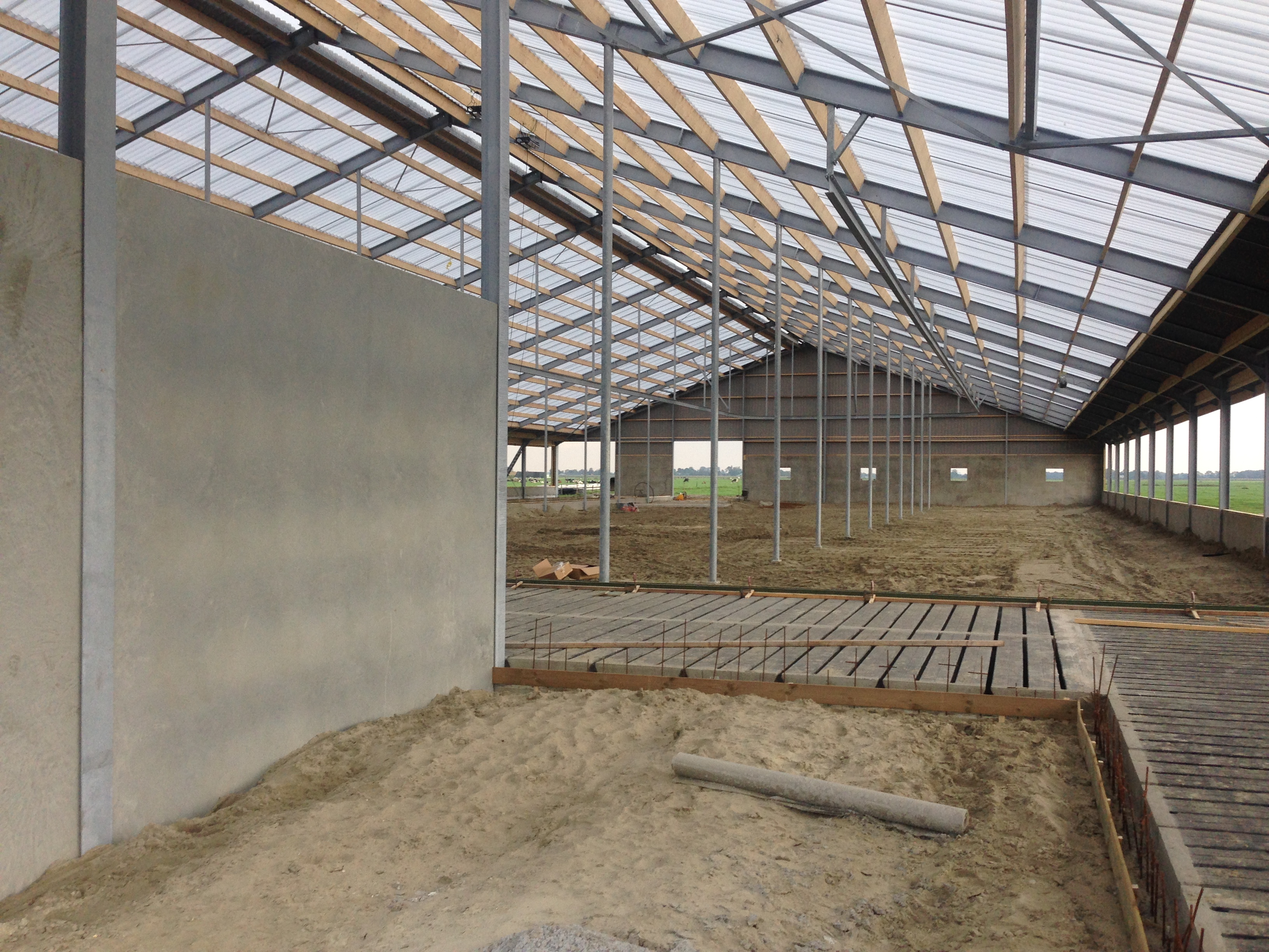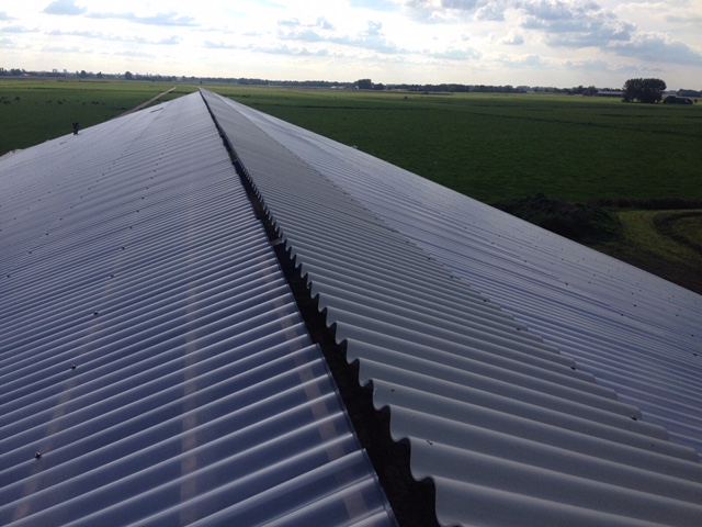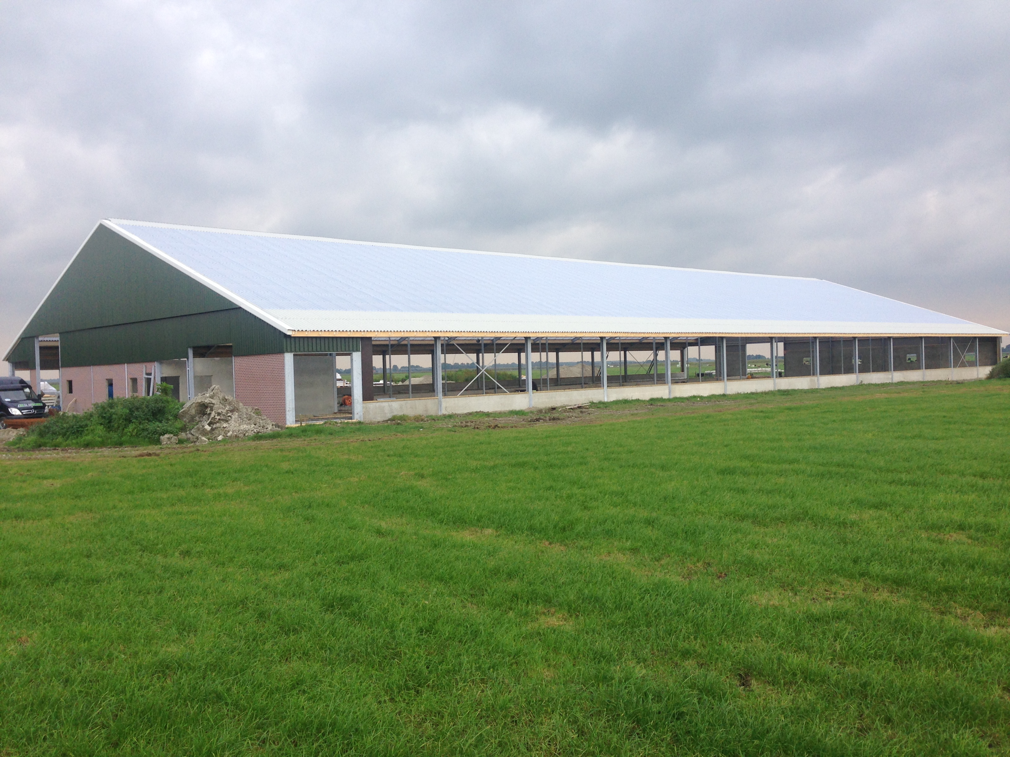 Man&Mach heeft voor een veehouderij in Stedum 3.000 m2 lichtplaten (type Heatguard 100) geleverd en gemonteerd. Daarnaast is gekozen voor 650 m2 Eternit golfplaten in de kleur wolkengrijs. Deze kleur komt heel dicht bij de kleur van de lichtplaten, waardoor het dak een mooie strakke uitstraling heeft. Voor de ventilatienok heeft Man&Mach met contraknikstukken van Eternit gewerkt. Deze hebben een betere luchtgeleiding dan traditionele bovenstukken. De gevel is afgewerkt met 350 m2 staalplaten van Corus HPS 200Ultra coating in Juniper Green. Aan de binnenkant is onder de onderste twee rijen golfplaten aan beide kanten brandwerende isolatie toegepast als windgeleiding. Ook in de technische ruimtes binnen hebben we brandwerende isolatie toegepast, brandklasse B totaal 465 m2. Verder is het geheel buitenom afgewerkt met zetwerk wit voor de windveren en groen voor de gevelplaten.