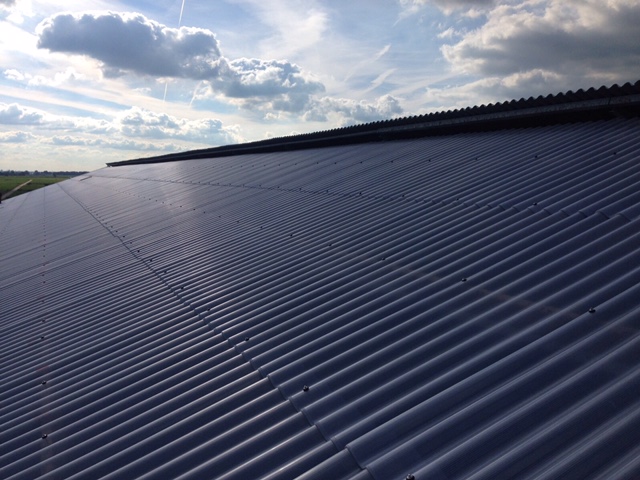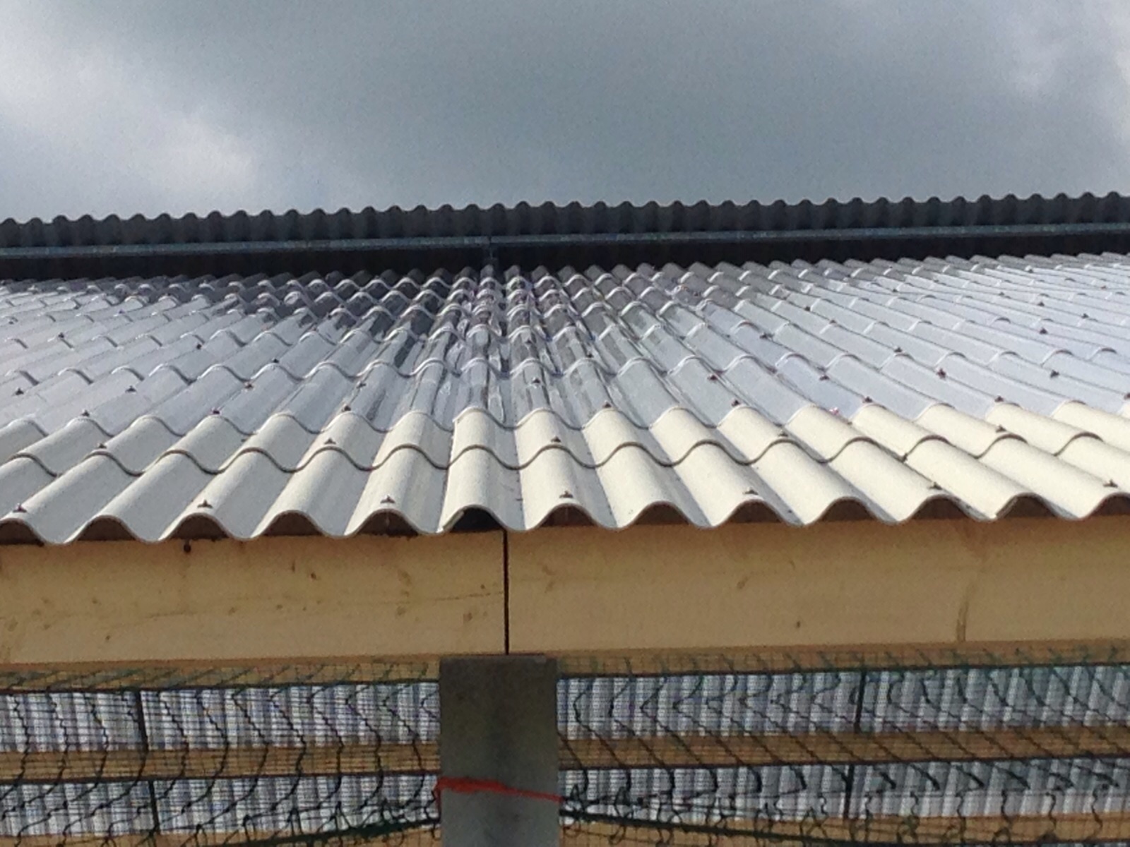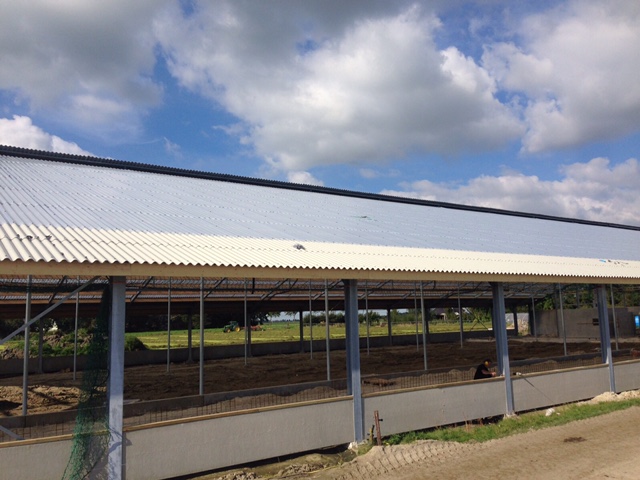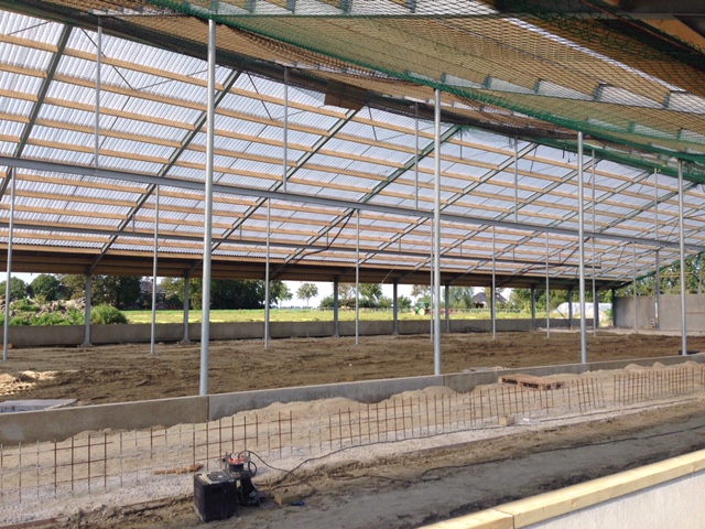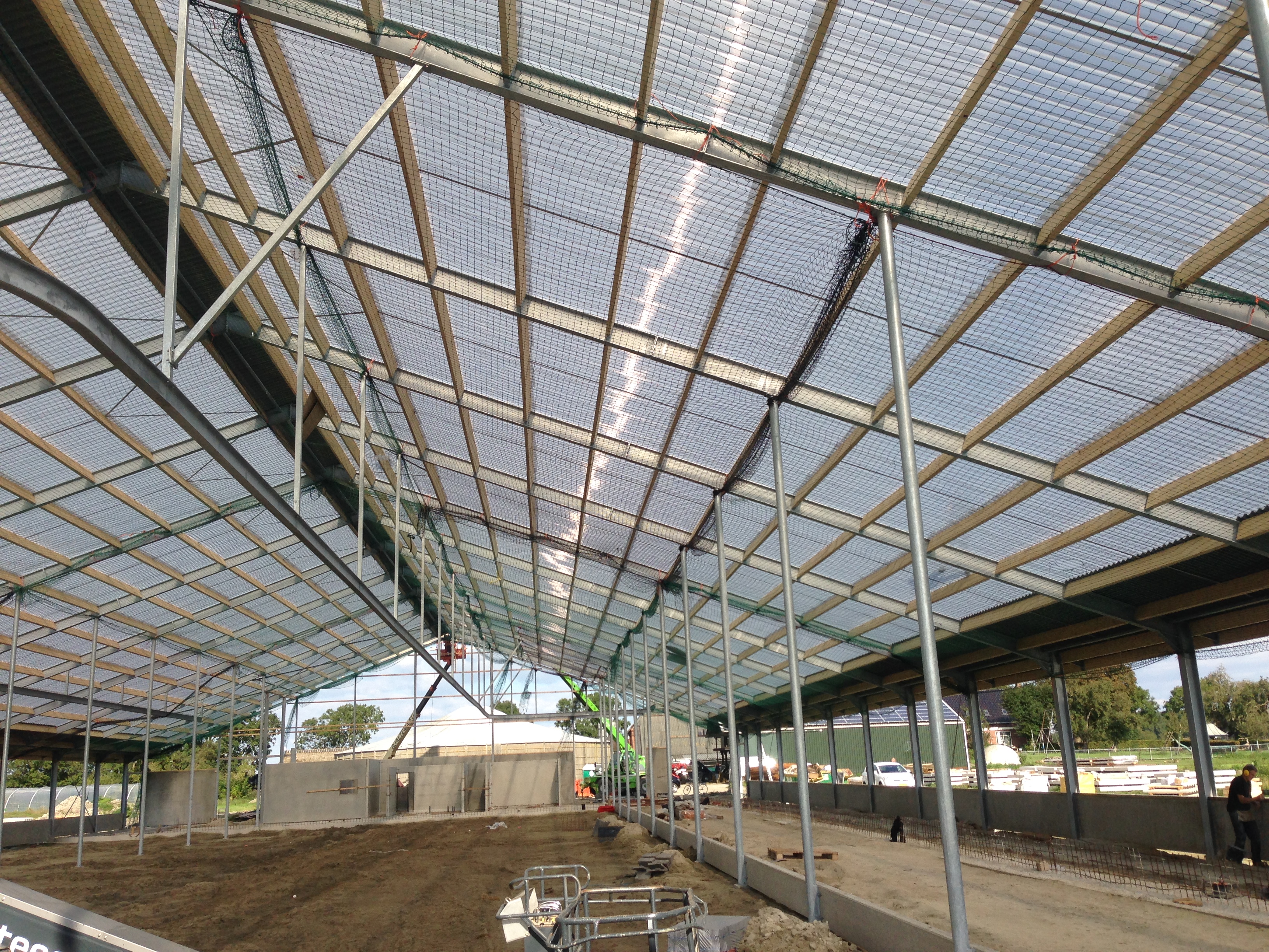 Man&Mach heeft voor een veehouderij in Stedum 3.000 m2 lichtplaten (type Heatguard 100) geleverd en gemonteerd. Daarnaast is gekozen voor 650 m2 Eternit golfplaten in de kleur wolkengrijs. Deze kleur komt heel dicht bij de kleur van de lichtplaten, waardoor het dak een mooie strakke uitstraling heeft. Voor de ventilatienok heeft Man&Mach met contraknikstukken van Eternit gewerkt. Deze hebben een betere luchtgeleiding dan traditionele bovenstukken. De gevel is afgewerkt met 350 m2 staalplaten van Corus HPS 200Ultra coating in Juniper Green. Aan de binnenkant is onder de onderste twee rijen golfplaten aan beide kanten brandwerende isolatie toegepast als windgeleiding. Ook in de technische ruimtes binnen hebben we brandwerende isolatie toegepast, brandklasse B totaal 465 m2. Verder is het geheel buitenom afgewerkt met zetwerk wit voor de windveren en groen voor de gevelplaten.
