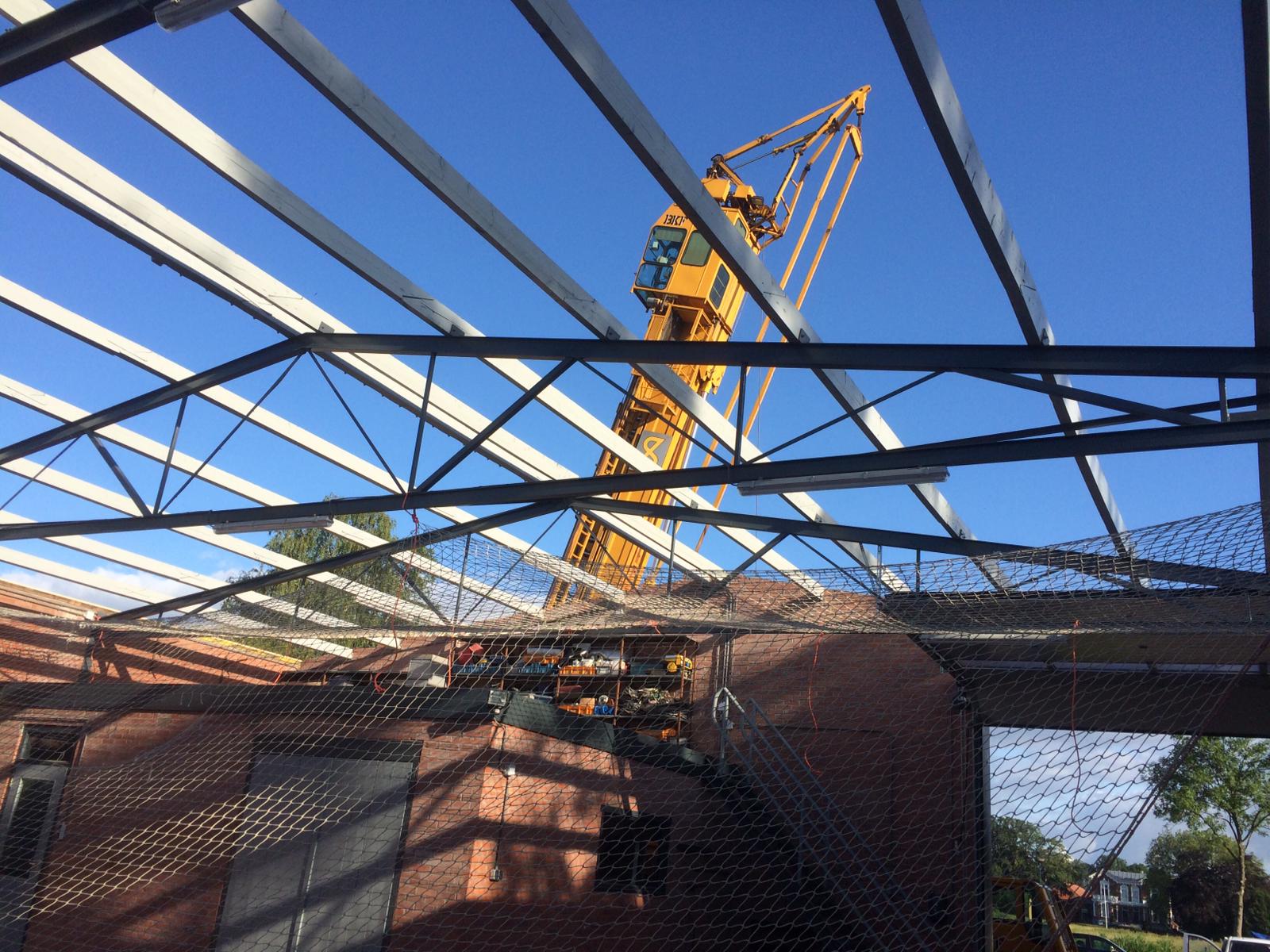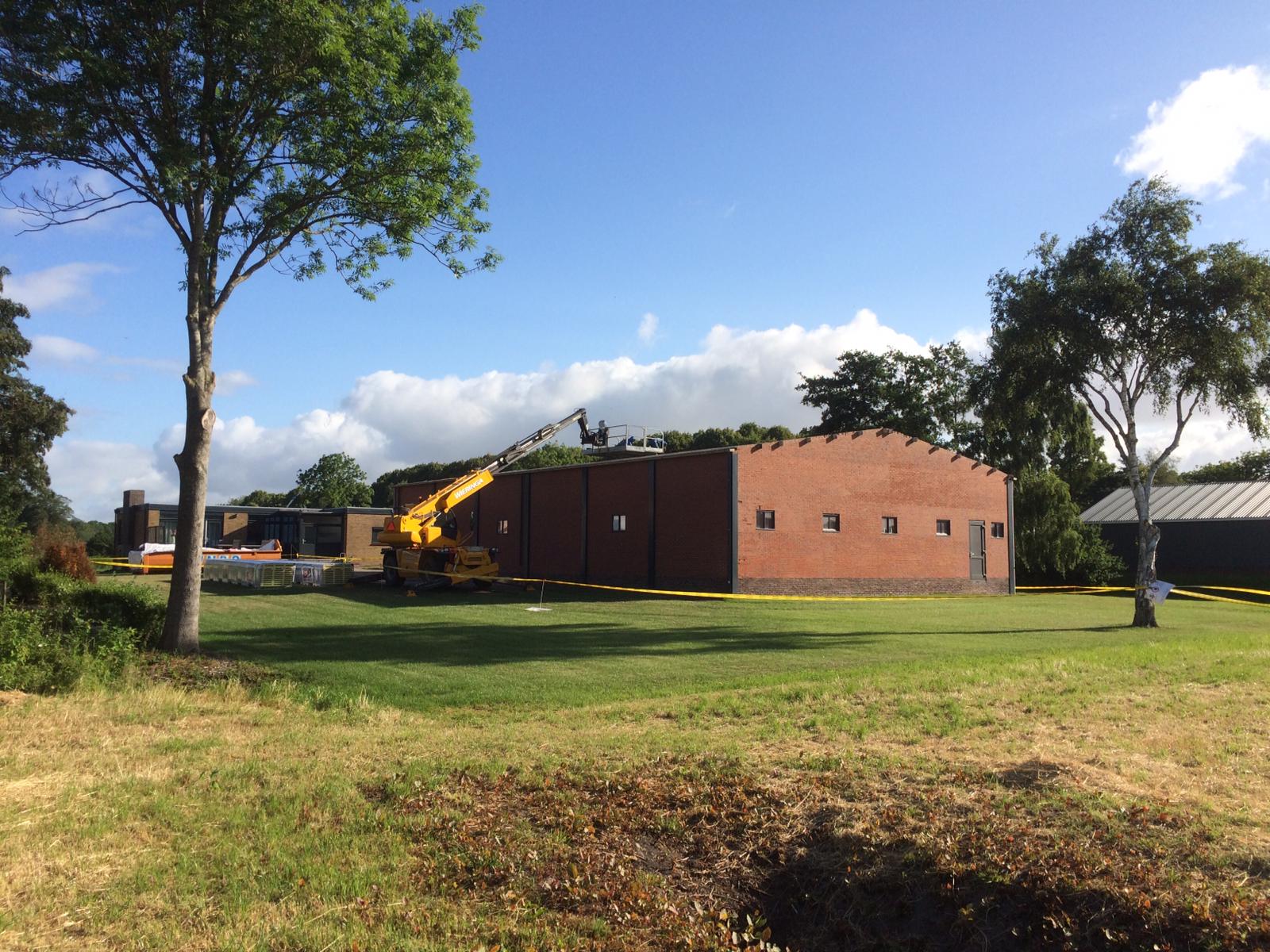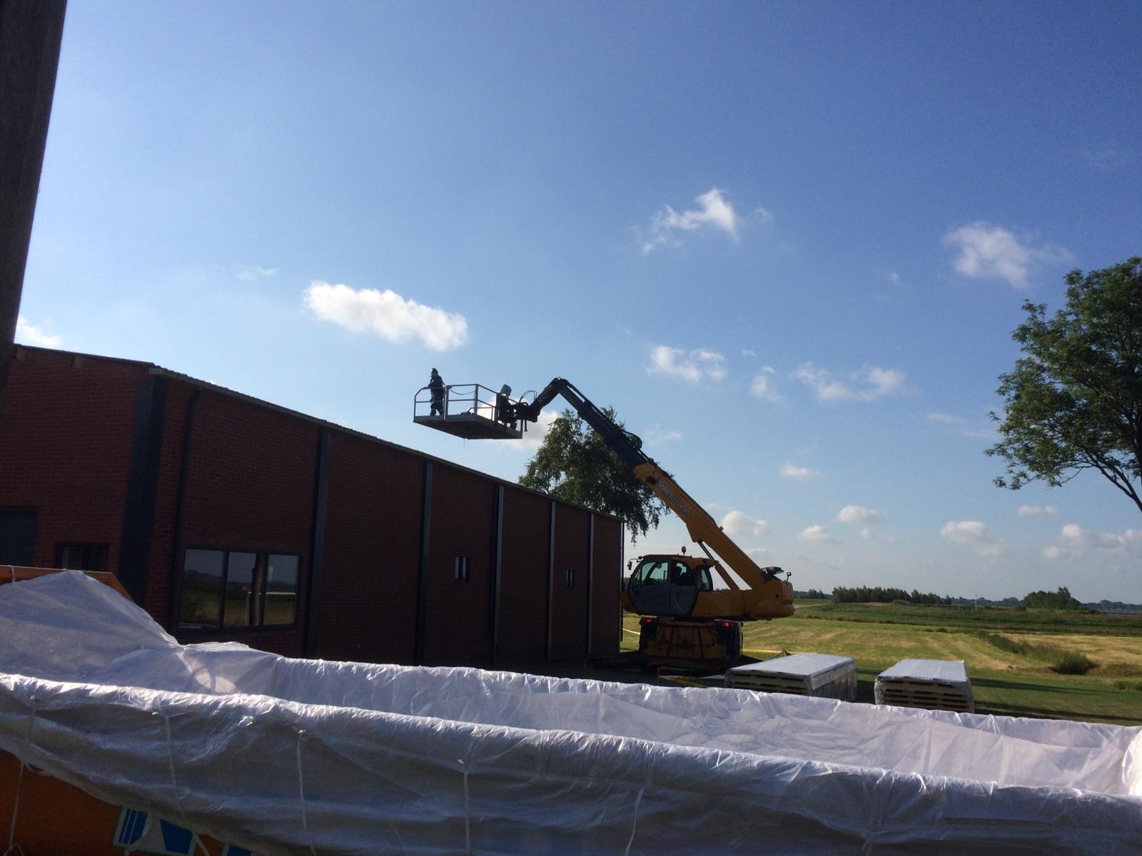 Renovatie loods in Oostwold Voor een lokaal schildersbedrijf hebben wij van de bedrijfsloods het asbesthoudende dak gesaneerd. De opdrachtgever heeft na het saneren zelf de spanten en gordingen geverfd, voordat wij de nieuwe geïsoleerde sandwichpanelen met een trapezium driekroons dak hebben gemonteerd. De opdrachtgever was zeer blij met de strakke planning van begin tot eind.